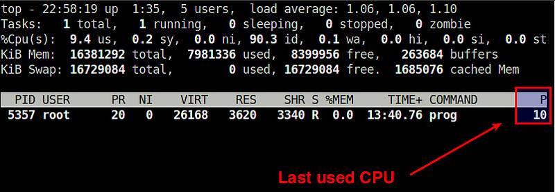 输出表示进程的 PID 为 5357(名为"prog")目前在CPU 内核 10 上运行着。如果该过程没有被固定,PSR 列会根据内核可能调度该进程到不同内核而改变显示。