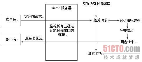 从守护进程的概念可以看出,对于系统所要通过的每一种服务,都必须运行一个监听某个端口连接所发生的守护进程,这通常意味着资源浪费。为了解决这个问题,Linux引进了"网络守护进程服务程序"的概念。Red Hat Linux 9.0使用的网络守护进程是xinted(eXtended InterNET daemon)。xinetd能够同时监听多个指定的端口,在接受用户请求时,它能够根据用户请求的端口的不同,启动不同的网络服务进程来处理这些用户请求。可以把xinetd看做一个管理启动服务的管理服务器,它决定把一个客户请求交给哪个程序处理,然后启动相应的守护进程。xinetd无时不在运行并监听它所管理的所有端口上的服务。当某个要连接它管理的某项服务的请求到达时,xinetd就会为该服务启动合适的服务器。xinetd模式的工作原理如图4-5所示。